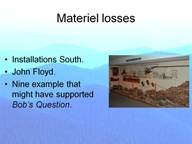 Of particular note is the action of Secretary of War John Floyd who single-handily transferred tons of supplies either into southern hands or placed them in a position where they could easily be seized. Picture if you will the ordnance depot at San Antonio. This was an immense collection of arms and ammunition that dropped like ripe fruit into the rebel basket. This story was repeated time and time again such that the Confederate States picked up more supplies just by walking in on government installations than from any battlefield loot or raiding party booty. The first major section of this presentation consists of nine examples of southern materiel gains from the military stockpile of the north. These stories form the backbone of the line of reasoning that led to Bob’s Question. As I have already suggested to you I was wrong about the question. Each of these vignettes will end the same way. None of them materially affected the war’s outcome. We are going to focus on Northern losses here in a moment, but as you know the Union did not lose every battle during this period. Although Shiloh and Antietam were pyrrhic victories, the boys in blue held the field after the battle and so lost little materiel. And there were some out right victories, like the aforementioned Mill Springs, where the North actually took significant supplies from the South.