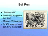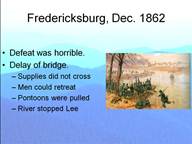 In a battle with a similar result, Ball’s Bluff in October of 1861, a rout of the boys in blue was highly publicized on both sides of the Mason-Dixon Line. Here, the Union troops were caught “astride the stream.” Those that made it across could not easily get up the steep embankment on the far side. But, with no follow up the defeat caused little damage to the total supply picture. As we get into 1862 Forts Henry and Donelson were northern victories and Pea Ridge was sort of a victory.