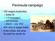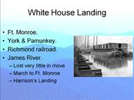 These numbers would not have been so bad if McClellan had actually done what he said he could do. If he had taken Richmond and if that had really ended the war, all would be forgiven, but of course he did not. The first major resupply point, after the initial point at Ft. Monroe, was at White House Landing on the north shore of the peninsula at the confluence of the York and the Pamunkey rivers. This was chosen because there was a railroad bridge that crossed the river and that line lead directly to Richmond. After defeats by Lee, McClellan’s army retreated, or as he put it “changed its base of operations” to ports on the James River. Notable of these was Harrison’s Landing. It was fortunate that Lee did not attack or destroy the beachhead there because the Union had the month of July and most of August to ship back to Washington the men and supplies not consumed in use. It should be said that Lee was not in any great shape for an attack as he had taken the worst of the battle losses.