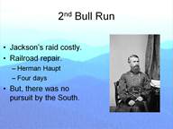 This loss of supplies has an interesting back-story about Union recovery. It weighs heavily on the conclusions near the end of my presentation. At the same time Jackson’s raid destroyed the supplies at Manassas the single track railroad bridges were also burned. The accumulation of these supplies and the tracks had been the work of Herman Haupt, the chief of US railroads in Virginia. He has been given credit for the exaggerated claim the he could rebuild railroad bridges faster than the Confederates could burn them down! Within four days of their destruction, Haupt had them replaced and trains ran over the line once again. Had McClellan wanted to move south he certainly could have.