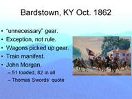Wagon trains supplied the army in this area because the railroads had been destroyed. As the army advanced you had increasing distances over which supplies had to move. A small footnote should record that these supply trains could easily retrieve the “dropped” gear. The management of this resupply operation is a key factor in this story of logistics. These trains were put on the roads in groups of 100 wagons each. The shipment had a train manifest so that the shipping point, the destination point, and the train itself knew what goods were on the train. The content of these manifests is what I will call later “information.” Each train had a quartermaster officer on board and responsible for the goods. On October 19th John Morgan’s cavalry hit one of these trains of 82 wagons. Only 51 of which were loaded. While it was a total loss, it did not have a big impact on the supply of the army. It did however cause the following story to circulate: The head of supply in Cincinnati, LTC Thomas Swords said: “I am in hopes soon of being able to supply all the wagons required if John Morgan does not take too many. [I] can hardly supply the wants of both ours and the Rebel Army without knowing how many they are to have.” This quote will be repeated later.