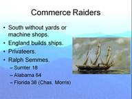 With a change in strategy, the South focused on sinking Union vessels rather than trying to bring them home and run the blockade. Raphael Semmes was a legend with his first raider, Sumter, even before he assumed command of Alabama. Sumter burned 18 vessels during the second half of 1861. Once he got Alabama he bagged 64 more US ships. Add in the count from Florida and you get a total of 120 ships. There were other ships, but these were the biggies. The bottom line on commerce raiders was that they did not alter the outcome of the war. They did divert ships from blockading and drove up the cost of insurance to astronomical heights, but they were insignificant in reducing the North’s materiel stockpile.