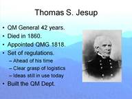 Father of the Modern Quartermaster Corps, he held the post of Quartermaster General for forty-two years. He died, with his boots on so to speak, in 1860. Rarely has one person stayed in the same position for such a long time. He has been described by one of his successors in that post as one of the most colorful and remarkable characters that ever occupied this position.
