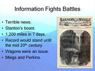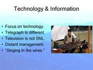 At this point I am going to introduce one of the few original thoughts that I had in doing the research for this talk. While I believe the organization of what I am presenting tonight is original, all of the stories I have been relating have been gleaned from others. OK, here it is: In the study of the American Civil War we tend to focus in on technology. Who among us is not interested in the Spencer rifle, ironclads, or large bore artillery? So too is the telegraph of interest to us. But the telegraph is in another class of military hardware. It is a processor of information. The former three items have but one function: To deliver fire on a target. The telegraph delivers information the content of which can vary from the sonnets of Shakespeare to the amount of rifles lost to some Confederate raider. The main points I want to make in this lecture is that people do not notice the difference between technology and information. They are not the same. With all due respects to Marshall McLuhan, the medium (technology) is not the message (information). That would be like saying Saturday Night Live is television. Or, to use a logistical setting, the account transactions that some quartermaster officer sent to Washington were the telegraph. We all appreciate the employment of the telegraph. But we fail to notice what the information allowed the user to do. For the first time in history a war could be managed from great distance. It was not the telegraph per se that did this. It was the information “singing in the wires” that made it so.