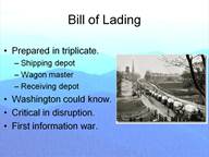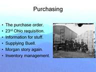 An interesting example occurred when Perkins was at Gallipolis, Ohio, in spring 1864. Now I know that this is outside of my timeframe, but when you hear the names you will understand why I wanted its inclusion. He received a number of requisitions for clothing, forage, and other articles for the 23rd Ohio Infantry. These were submitted by Lt. William McKinley, the unit’s regimental quartermaster. And, get this, they were signed by none other than Col. Rutherford B. Hayes, commander of the regiment. Those documents are unique and very valuable, as they contain the only known samples of both future presidents' signatures on the same item! All of these management systems go back to Jesup. What the technology of the telegraph did was to make existing systems faster and therefore timelier. There is a further benefit that accrues once you speed up an information system. You can make a trade off of information for stuff. For my entire professional career I developed, sold, and implemented logistical control software. This ranged from simulation models to operational programs to plan and control manufacturing. Much of this was inventory control as we have been discussing all evening. And what is the object of inventory control? It is to accomplish the mission, be that a lean manufacturing company or to provide materiel on the battlefield. If you know what the demands for stuff are you can hold back the goods and ship them just in time to where they are needed. Think about this for a minute. Without a rapid reaction system a depot might have to supply two units who might go into combat with two complete sets of materials. With a rapid reaction system you may need only supply one unit. Then, sometime later you might ship the excess that the unit did not use to the second unit. Thus the overall amount of stuff is far smaller. You have traded information for stuff. That is all well and good for modern times. How did this inventory theory work out during the Civil War? At the end of July 1862 Perkins was supplying Buell’s army in northern Alabama using railroad connections from Nashville to Decatur, AL. When the railroad service was disrupted he was forced to reroute his supplies using telegraph messages. Instead of storing all of the supplies in the forward areas where Buell’s army might go he could ship the goods a long distance and keep changing the destination as Buell shifted position. He could do this even when his supply line was interdicted by enemy action, when Buell’s supply officers made errors in their orders, and when other’s made demands on theater inventories. What Perkins was doing was trading information for stuff. If you have the information you may not need as much stuff. Let me retell a second story that ends with a touch of humor I have already related. In the fall of 1862 Col. Thomas Swords was the assistant quartermaster general with his headquarters in Cincinnati. Under him was one Capt. Walworth Jenkins who was in charge of the depot in Louisville. The famous rebel marauder John Hunt Morgan greatly disrupted supply operations in the area of Bardstown, KY, not too far from Louisville. During one such raid on October 19th Morgan captured 51 loaded wagons and 31 empty ones. Jenkins wired Swords for help in replacing the lost materiel. Swords endeavored to replace the wagons and livestock quickly, shipping them by water rather than the considerably cheaper method of driving the overland. “I am in hopes soon of being able to supply all the wagons required if John Morgan does not take too many,” he assured Capt. Jenkins. He added wryly, “[I] can hardly supply the wants of both ours and the Rebel Army without knowing how many they are to have!” All humor aside, Swords was able to do this because he had the information almost at once. From the inventory data and the wagon train bills of lading he knew what had been lost and what he needed to send to Jenkins. Because he knew what his barge status was he knew how he was going to resupply Louisville. This is an excellent example of real-time inventory management.