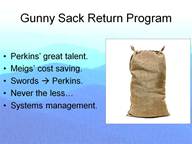 Never the less, Perkins gave an excellent accounting for this government property. Everyone who exchanged the bags including QM sergeants, company & regimental officers, brigade & divisional quartermasters, and depot quartermasters had to exchange the appropriate documents. In this the levels and flows were accurately accounted. I bring up this story because it is cute, but don’t miss the importance of systematic management that backs this tale. Everything from warships to gunny sacks was managed in a highly professional manner. That is the point.