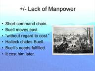 The problems caused by the lack of manpower are practically uncountable. And this deficiency was not just in the ranks of the officers. Of the hundreds of examples I could cite one aspect of the supply issues confronting Buell in his effort to move east in 1862 is an excellent illustration. Among his many needs, Buell wanted teamsters. His chief quartermaster asked Swords to furnish 100 men and then 200 men and that they be hired “without regard to cost.” With great difficulty 100 men were sent. It was not enough for the huge volume of government wagon traffic. As he prepared to move out Buell really needed 300 more. The shortage of teamsters not only posed a threat to Union logistics but also aggravated the conflict brewing between Halleck and Buell. When Halleck ordered Buell to operate against Chattanooga he directed Buell to turn over a significant portion of his wagons to the depot in Corinth. To drive his point home Halleck explained that Buell had twice as much transportation as either Grant’s Army of the Tennessee or Pope back east. Halleck claimed that Buell’s wagons had been idle. Buell retorted that the transport was hurt by teamsters running off and besides he had just been ordered to move east. Old Don Carlos was right about his needs as rail and river transportation was lacking at this time in northern Alabama. In the end he got what he needed because theater supply people looked around every corner and left no rock unturned. It was to Buell’s sorrow that he moved too slowly with what he was given that was to later cost him his job.