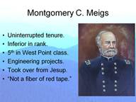 Jesup promoted regular procedures that included each quartermaster officer at each supply depot around the country to submit monthly and quarterly reports to Washington. In a minute I will introduce you to levels and flows, but it suffices to say that now Washington would know what is in each location and how that was changing over time. To make this operational he instructed his officers to use 37 standard paper forms. Stop right here and think about this 1825 example of systematic management. 37 documents can control an Army! And these reports were not just sent to headquarters and filed. Jesup had a team of officers studying these papers to manage the business of defense. If something was amiss or not clear after close scrutiny the reports were sent back for correction. The quartermaster’s shop was run to exacting standards in the 40 years run up to the civil war. This was extraordinary during a time when such a thing was virtually unheard of in neither American government nor business. Although he is seldom recognized as such, Jesup ranks as a pioneer of systematic management. In addition to the creation of a 19th century management information system of awesome power, Jesup was a “people person.” He surrounded himself with a cadre of young bright managers to execute his plans. In July of 1838 Congress passed new legislation which allowed for 30 commissioned quartermaster officers at the rank of captain or above. Of the original 30, nine would serve as senior quartermasters for the North in the Civil War. This gave the Union a great deal of continuity in order to execute the vast build up of supply we have discussed earlier. The importance of supply and the systems developed by Jesup is why Miller entitled his book on Montgomery Meigs: Second Only to Grant.