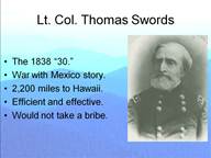While this is not a Civil War story, the following will give you some idea of what kind of a “take charge” guy this chap was. At the beginning of the war with Mexico, Swords rode with Stephen Kearney to San Diego. Upon arrival he realized that there were few local sources for clothing and other goods the men needed. Responding to this problem he chartered a ship to take him to the Sandwich Islands, today’s Hawaii, about 2,200 miles away. After 18 days at sea he landed in Honolulu where he bought garments and construction materials on government credit. He then sailed safely back and distributed his supplies. Since Swords was Perkins’ boss and he worked directly for Meigs, many of the brief vignettes I have been telling you all evening centered on his command. From all accounts I have read Thomas Swords carried out his duties both efficiently and effectively. In June of 1862 he was in charge of the Louisville depot. A potential supplier approached Swords offering a kick-back. Swords wrote the following back to the gentleman: “In regard to my retaining ‘whatever per cent I wish to pay me for my trouble’ I have to inform you that I am paid by the United States, for trouble and everything else incident to my office.” Such were the men serving in the Quartermaster’s Department.