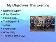 I concluded my talk with the most important element of all. That would be the men who made it happen. I, for one, was most impressed with the quality of those who served in the Quartermaster’s Department. Too me, it was very close to what Churchill said of the men of the RAF in World War II. “Never in the field of human conflict was so much owed by so many to so few.” Thank you. Last changed: 07/16/10 |